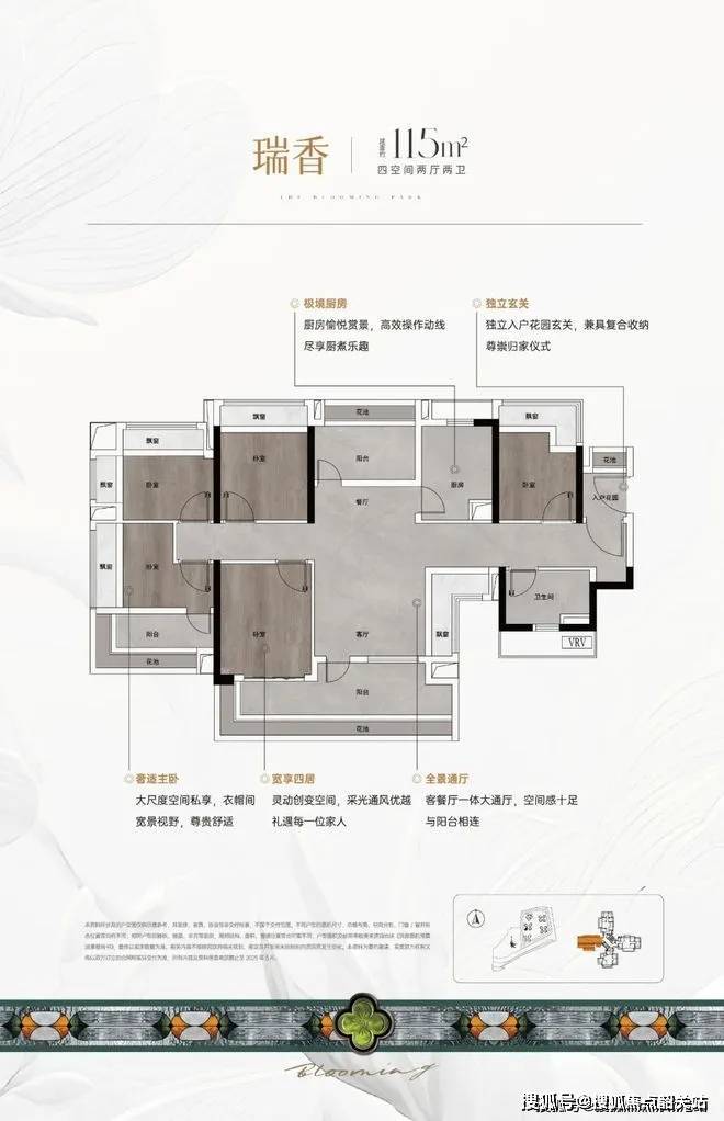 建面115㎡南北对流四房:多开间朝南,阳台和花池设计使空间阔绰实用;