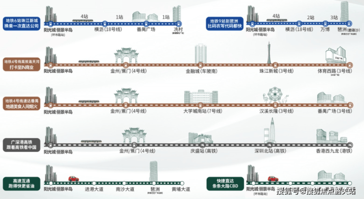 阳光城丽景半岛距离地铁蕉门站和金洲站仅约1公里,且临近规划中的15号线,未来可通过地铁网络快速直达珠江新城等地,实现湾区内的便捷通勤。