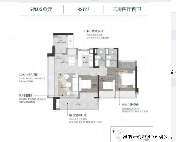 项目户型采用全南向布局,能够最大限度地保证室内采光与通风,让房间内时刻保持明亮、通透的状态,提升居住舒适度。阳台尺寸设计宽大,不同户型阳台开间各有亮点,其中88平户型阳台开间约6.2米,105平户型约6.5米,125平户型达到8.3米。宽大的阳台不仅拓展了室内使用空间,还为业主提供了观景、晾晒、休闲的多功能区域。
