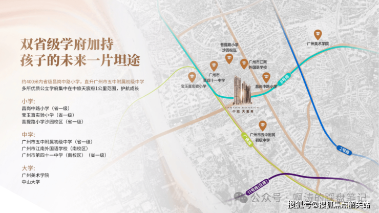 项目位于海珠区最强教育板块,根据广州市海珠区教育局政府信息公开网站,《2023年海珠区公办小学招生服务地段表》中显示,项目所属沙园街橡胶新村社区,直接对口省一级昌岗中路小学。同时,《2023年广州市海珠区初中招生问答》中显示,昌岗中路小学直升广州市五中附属初级中学。