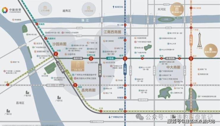 买房③要素,地段、地段、还是地段,项目位于海珠昌岗中路与宝岗大道交汇处,宝岗大道、工业大道、江南大道,海珠三大黄金走廊环绕。