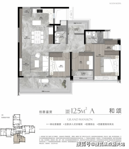 约125㎡A户型:南向巨幕阳台景观,生活空间更加开阔。