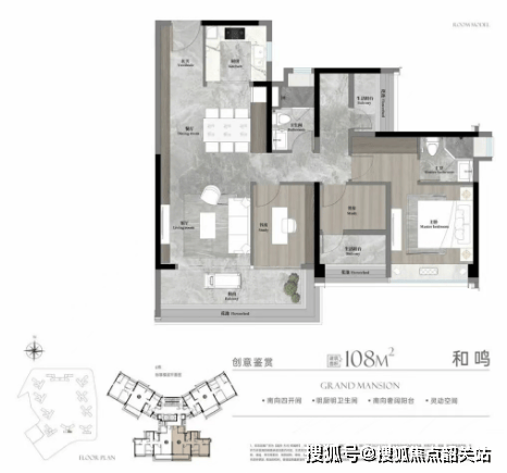约108㎡户型:南瞰城市中轴景观,小户型也有大视野。