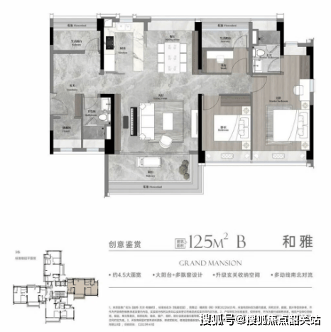 约125㎡B户型:4.5开间朝南全明通透,提升居住舒适度。