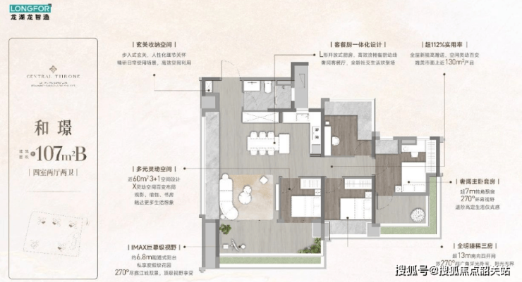 建面107平四房两卫:四开间朝南,3+1房布局,约6.8米跑道式阳台,总价340-380万左右。