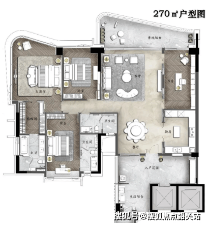 A 户型:270㎡环幕江景四房,约 9 米超大邮轮式阳台,一线望江无遮挡,专梯专户设计,配备墅级空中双花园和约 28㎡超大私家庭院,多功能空间丰富,约 42㎡超大主卧空间,270° 环幕江景,阔绰双主套房设计,尽显奢华舒适。
