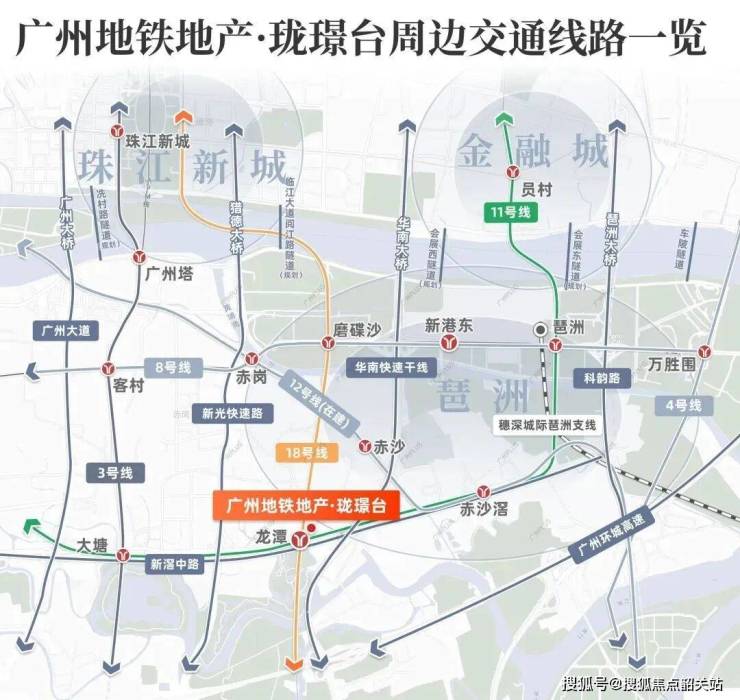 珑璟台是一个TOD社区,不仅连通地铁站台,还将利用裙房、架空层等打造空中花园、商业体,实现真正的“地铁入户”。项目位于18号线龙潭站上盖,并连接广州首条大环线11号线龙潭站,使得前往珠江新城、琶洲、白鹅潭等地变得极为便捷。11号线串联广州三大发展中轴,而18号线则是联通多个湾区城市的“湾区之王”。
