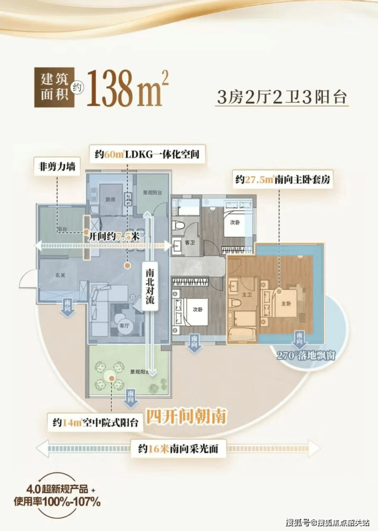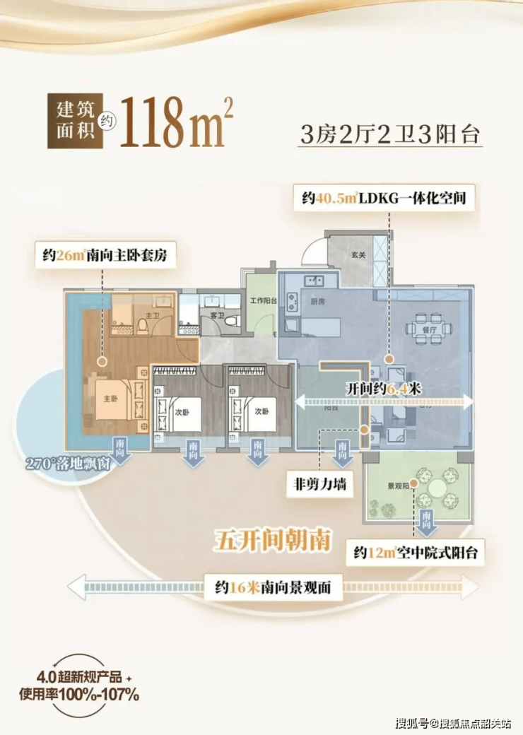如果说地段是房子的“骨”,那么户型就是它的“魂”。城发文华公馆此次推出的118㎡、122㎡、138㎡三大户型,全部采用新规下“阳台占比约30%”的创新设计,使用率高达100%-107%,远超市场平均水平。更令人惊艳的是,每户均配备院落式大阳台,南向面宽达16-17米,堪比空中庭院。118㎡户型实现五开间朝南,在禅城极为罕见;122㎡四开间朝南,北向次卧静谧宜居;138㎡则打造三面采光、270°全景落地窗主卧套房,南北双阳台对流,通透感拉满。这些户型不仅空间利用率高,更通过大尺度阳台模糊室内外界限,将亚艺湖的绿意与阳光引入生活日常,真正实现“住在公园里”的理想。