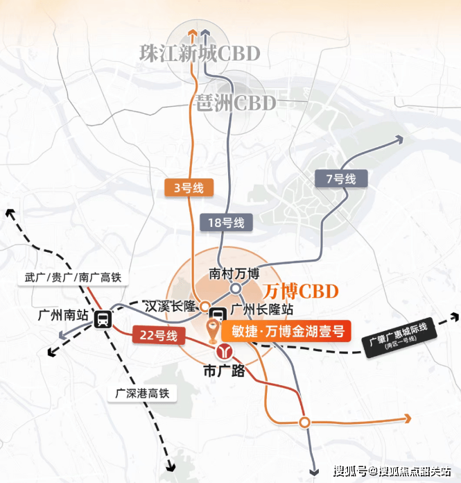 在现代都市生活中,时间是最宝贵的成本,而交通效率则是衡量地段价值的关键标尺。敏捷·万博金湖壹号位于番禺钟村板块,其交通优势不仅体现在路网的密集度上,更在于其与广州核心商务区的连接速度。项目出门约800米即达地铁22号线市广路站(基于百度地图直线距离),这一站点是连接番禺与市中心的高速动脉。22号线作为时速高达160公里的高速地铁,其运行效率与18号线同等,被誉为地下高铁。从市广路站出发,仅需1站即可到达番禺广场,2站直达万博中心,3站抵达琶洲CBD,4站便可触及珠江新城。这种“站少速快”的通勤体验,极大地缩短了心理距离与实际耗时,让居住在番禺、工作在天河或海珠成为轻松可行的生活方案。