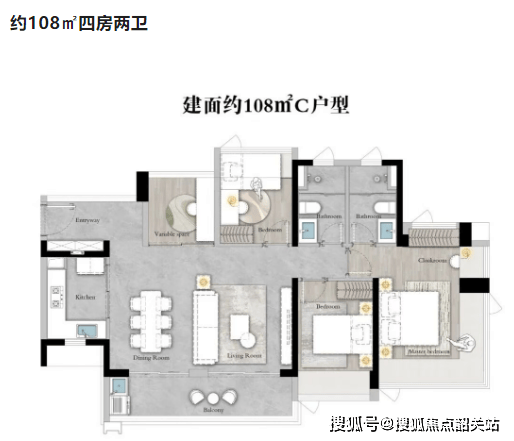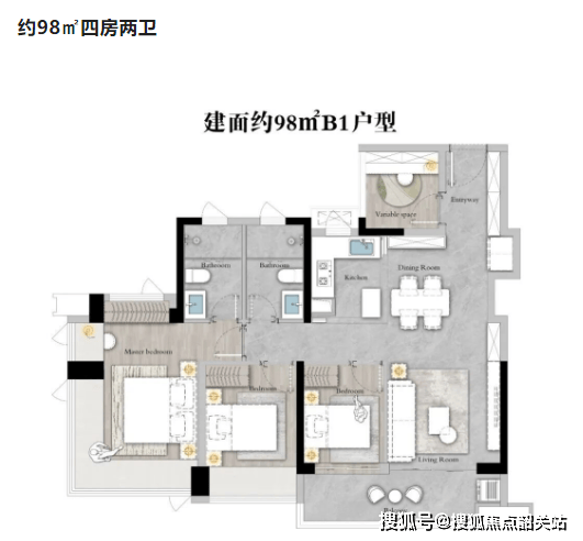 约98㎡四房两卫:更大的空间布局,适合追求宽敞生活的家庭,同样具备高效的空间利用率。