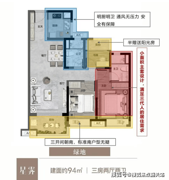96㎡三房两厅两卫:三开间朝南,明亮通透,部分户型赠送阳光房,性价比拉满;