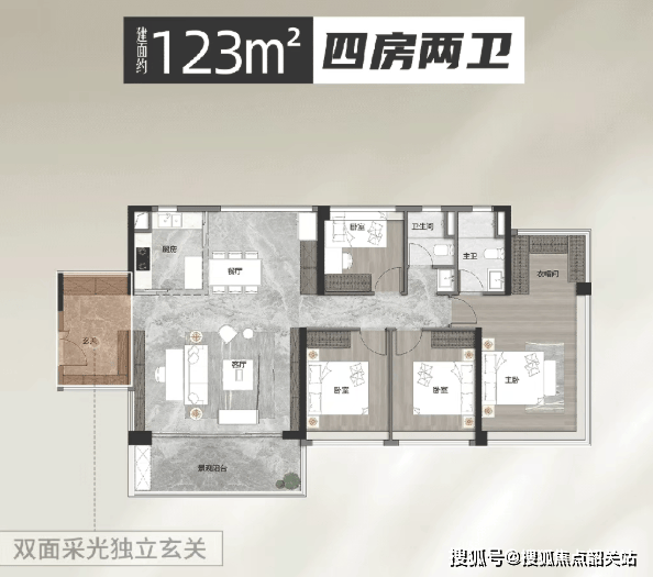 建面约 123 平方米四房户型,卧室空间宽敞,均可放下 1.8 米大床,居住体验堪比 144 平方米大宅,品质感十足,适合追求舒适居住尺度的改善家庭,无论是日常居住还是亲友小聚,都能从容应对。