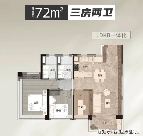 建面约 72 平方米三房两卫户型,是天河稀缺的小户型双卫浴产品,也是天河最小面积的南向三房两卫。该户型做到入户花园设计,南向四开间采光,空间利用率极高,实际使用空间堪比传统 90 平方米户型,三个卧室全部朝南,阳光铺满每一个房间,双卫设计避免早高峰洗漱拥挤,总价 300 多万即可上车天河芯,打破天河高房价壁垒,是刚需置业者的福音。