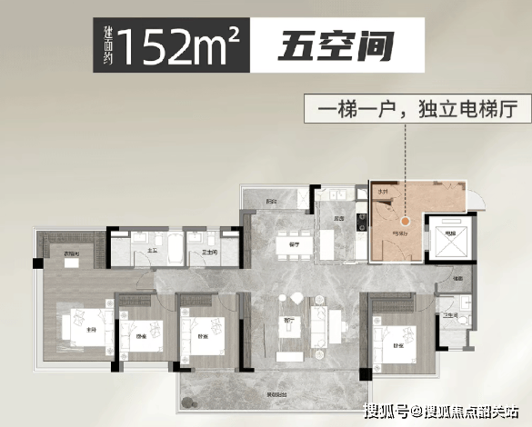 建面约 152 平方米五空间户型,是项目唯一的 14 层板楼小高层产品,一梯一户设计,LDKG 超级公区搭配南北双阳台,9 米宽主阳台直望杨梅河景观,双南向套房设计,主卧配备超大衣帽间与浴缸,酒店级套房体验,为高端改善家庭打造专属奢居空间。