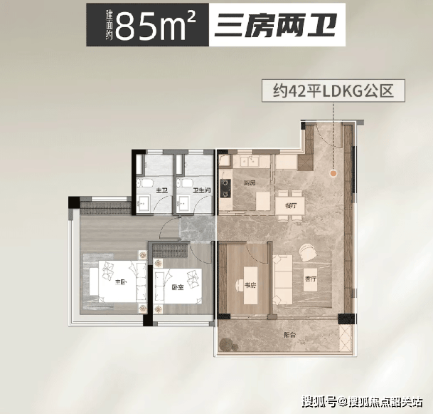 建面约 85 平方米三房两卫户型,配备 6 米超大景观阳台,视野开阔,采光通风效果极佳,空间布局合理,动静分区明确,相较于市场同面积段产品,空间尺度与功能性全面越级,满足年轻家庭与三口之家的居住需求,高性价比与实用性兼具。