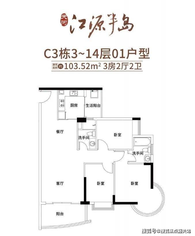 95㎡三房:东南向望江,三开间朝南,俯瞰珠江与金融城景;进深12米,面宽约9.8米,全屋动静分区;L型厨房,科学动线,提高空间利用率;双阳台打造,生活景观两不误。