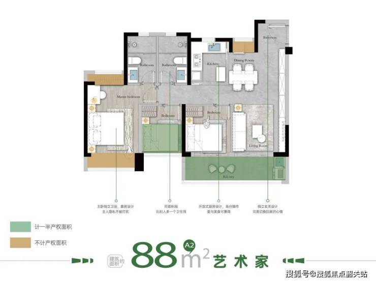 - **88㎡三房两厅两卫**:主卧带独立卫浴,5.4米阔绰阳台,南北通透格局,以刚需面积实现改善功能;