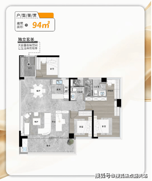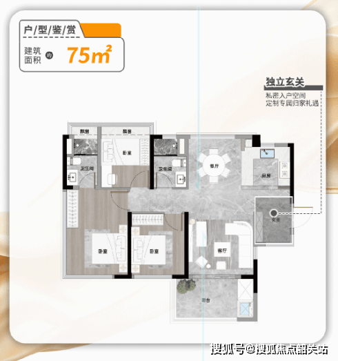 约75㎡东南向三房:独立玄关可改造储藏室,U型厨房提升操作效率,主卧带独立卫浴及270°观景视野,空间利用率堪称同面积段“天花板”;