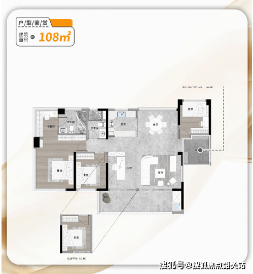 约108㎡南北对流四房:南向面宽约15米,媲美200㎡大平层尺度,7.2米阔景阳台连通餐客厅,主卧配置步入式衣帽间,私密性与功能兼备。