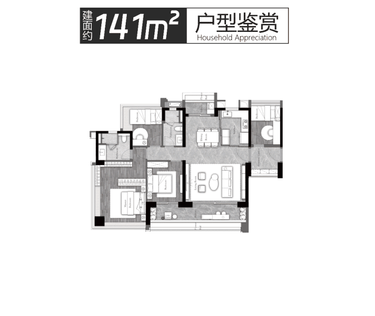建面约125平方米的户型则呈现为3房2厅2卫加灵动空间的格局,实现了全明4开间朝南,大面宽达到约12.8米。该户型同样采用了IMAX大方厅设计和LDK一体化布局,并配备了全屋科学收纳系统,进一步提升了空间的实用效率。对于追求更宽敞居住体验的购房者,建面约141平方米的户型提供了约14.6米的IMAX级采光视野,以及约8.2米的景观大阳台。主卧采用了端厅设计,拥有270°的全景采光视角,能够直接俯瞰滨水美景,极大地提升了居住的感官享受。