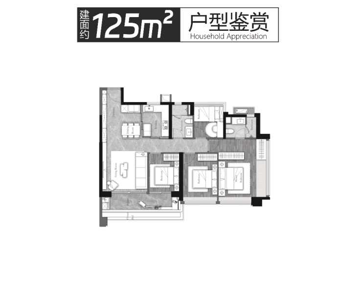 顶配产品为建面约186平方米的四房户型,分为01和02两个单元,均享有正南向的一线花地湾河涌景观。该户型拥有约18.3米的极致奢幕视野,全明四开间朝南。内部动线设计上采用了LDKB(客餐厨阳台)洄游路线,超80平方米的多功能巨幕宽厅配合多功能岛台,既满足了家庭聚会的需求,也提供了灵活的展示与收纳空间。主卧套房面积超过40平方米,配备了精致的展示柜,营造出类似酒店总统套房的居住体验。在交付标准上,项目汇聚了德国柏丽橱柜、博世家电、大金空调等国际一线品牌,力求在硬装品质上与高端改善定位相匹配。值得注意的是,3栋户型的得房率达到了100%,这在超高层住宅中显得尤为难得,直接降低了购房者的公摊成本,提升了实际居住面积的价值感。