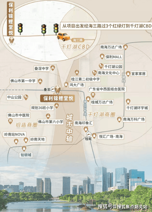 保利锦鲤堂悦地处祖庙、千灯湖交汇处,占据佛山城市与人文价值的双制高点。这里不仅是佛山经济最为蓬勃的区域之一,还承载着岭南千年文脉的精神与底蕴。项目距离千灯湖CBD仅约1.5公里,距祖庙商圈约3公里,真正实现了都市繁华与文化底蕴的完美结合。