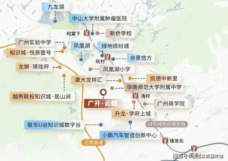 尽管广开云翰距离地铁14号线汤村站有一定距离,约2公里,步行不太现实,但周边的交通网络正逐步完善,为住户出行提供多种选择。14号线串联起从化、知识城与天河等区域,为住户前往广州中心城区提供了便利。未来,随着永九快速(建设中)等交通干道的建成,驾车出行将更加高效,快速接驳科学城及天河,大大缩短通勤时间。同时,项目周边的高速公路网络发达,花莞高速知识城出口、广河高速、华南快速干线以及建设中的从埔高速,让住户能够便捷地畅行湾区核心城市群。无论是前往深圳、东莞等城市开展商务活动,还是到周边城市休闲旅游,都能轻松实现,真正实现了轻松穿梭湾区各处,满足住户多样化的出行需求。