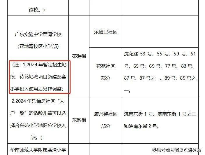 当然,今年省实的招生表上有个注明:“2024年暂定招生地段;待花地湾项目新建配套小学投入使用后另作调整”,即今年暂定这样,之后可能会有变动,所以具体还是要以当年的教育局招生计划为准。