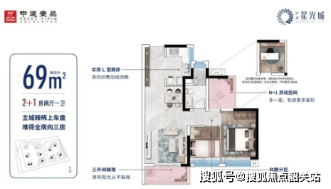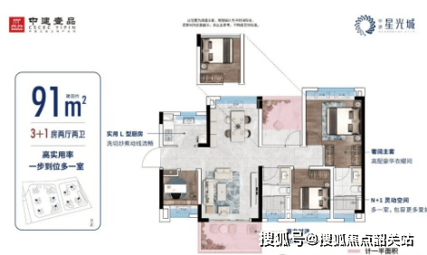 中建·星光城提供多种户型选择,包括约69-100平方米的三房至四房单位,所有户型均为南向布局,空间利用率高达94%,保证了良好的采光和通风效果。特别是建面约91平方米的南北通透四房户型,宽敞明亮,适合大家庭居住。