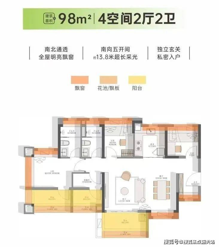 建面103平四房两卫,LDBK一体化设计,书房并入客厅,次卧还能做到床不靠窗,还有良好的动线空间,另一间北向次卧可用作二套房,主卧约280度飘窗,南北对流。