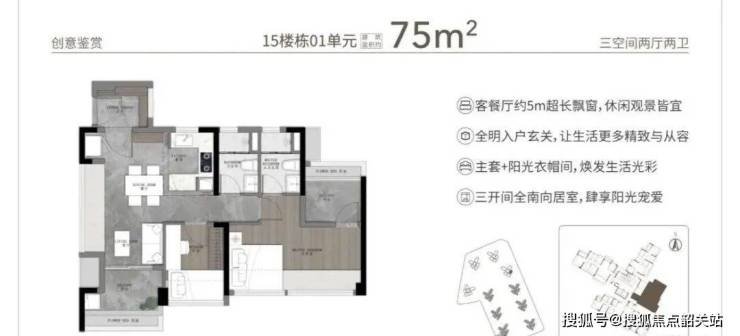 建面76平三房两卫,一进门就设置了入户玄关,能增加收纳空间之外还很有仪式感,客厅可以将飘窗打造为沙发,放大公区位置,主卧和次卧均为南向,U型厨房,整体来说,麻雀虽小五脏俱全。