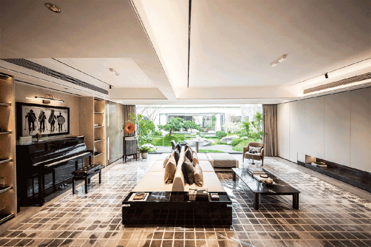 由于客厅本身尺度足够阔绰,加上连通超6.4米南向阳台,如此设计,拥有收纳功能的同时,空间的尺度感也没有被影响,反而倍感奢阔。