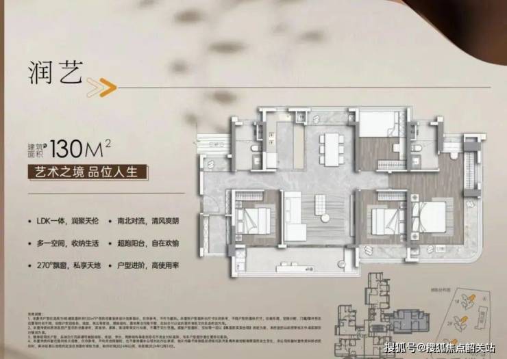 建面130平四房两卫:入户即见对景式玄关,LDKB一体化设计,客厅宽敞明亮。