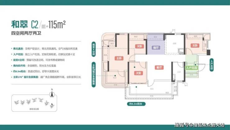 115㎡户型:楼王户型,四房两厅三卫,双套房设计,匹配财富阶层的终极居所。