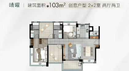 103㎡四房:横厅设计搭配 6.1 米景观阳台,让阳光与清风充分入户,提升空间通透感。主卧配备 270° 转角飘窗与独立衣帽间,不仅增加采光面,还为业主打造了舒适私密的休憩空间,彰显品质生活。