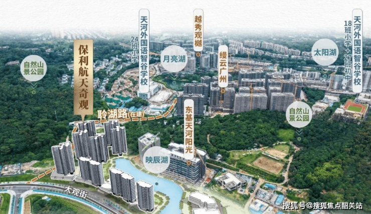 保利辰园湖境(航天奇观)坐落于天河智谷片区核心区域,地处世界大观板块,北接智慧城与科学城,南距金融城仅8公里、珠江新城15公里,占据广州“东进”战略核心脉络。项目容积率仅2.07,是区域内罕见的低密度住宅,坐拥“四湖三山”生态格局:南侧打造约1.13万㎡映辰湖,周边环绕中心湖、太阳湖、月亮湖四大人工湖,以及钟岭、横岭、大山等自然山体,绿化率达38%,楼间距最宽超40米,静谧舒适人居环境无可复制。