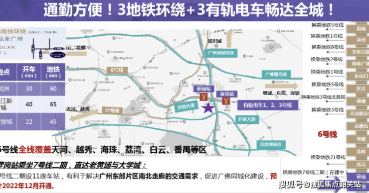 保利罗兰国际四期在交通维度构建了“三地铁+主干道+公交+有轨电车(规划)”的立体交通网络,通勤效率与出行体验在黄埔区府板块处于领先水平,尤其适合依赖公共交通往返核心城区的改善型人群。项目最核心的交通优势在于近地铁,距离地铁6号线萝岗站直线距离仅336米,步行4-5分钟即可抵达地铁站,无需依赖接驳工具,真正实现“地铁口安家”。借助地铁6号线,可快速换乘至地铁21号线(已全线开通)、5号线等线路,直达珠江新城、天河CBD、越秀老城区、白云新城等核心区域,例如前往珠江新城仅需30分钟左右,前往天河客运站约20分钟,完美解决日常通勤需求;未来规划的地铁7号线二期开通后,将进一步打通与番禺、海珠等区域的快速连接,实现“3条地铁直达市区”的交通红利,出行选择更丰富。