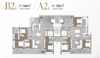 164㎡户型:拥有约26㎡庭院,四开间朝南,约12.4米南向大阳台,主卧开间约4.3米,并设有步入式衣帽间。