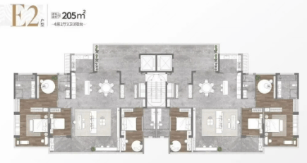 205㎡户型:采用中西双厨设计,配备灵动岛台,庭院面积达约32㎡,南向面宽约19.8米,阳台超36㎡,社交空间超90㎡,主卧私人空间约40㎡,并设双套房。