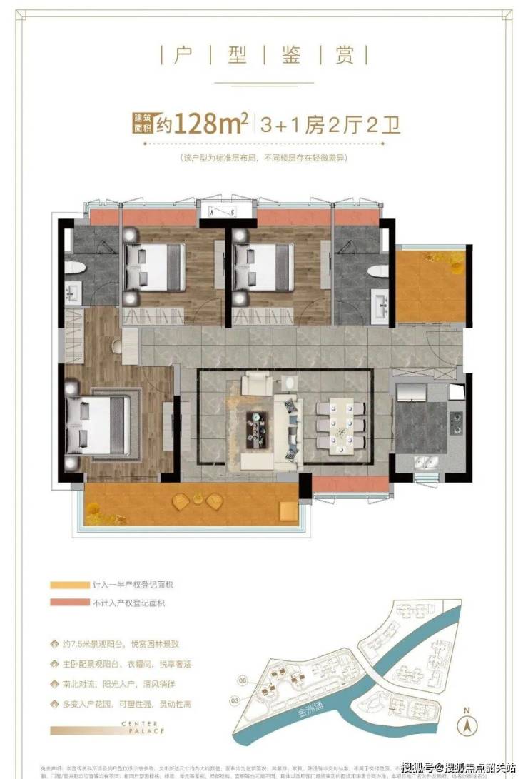 整个项目总占地约8.3万㎡,总建筑面积约35万㎡,内部分为A、B、C、D共4个区域,每一区之间有金洲涌分隔。由于是旧改项目,所以C、D区用作回迁安置,共有8栋,以两梯六户跟两梯四户为主。A、B区8栋为商品房。