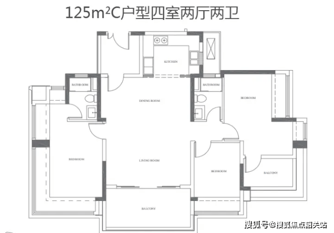 比如 125 平方米的四房,客厅面宽有 5 米,带一个大阳台,主卧做了套房设计,带独立卫生间和衣帽间。