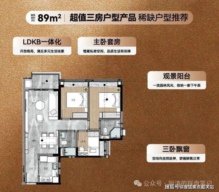 89㎡三房两卫:经典竖厅设计,户型方正通透,动静分区明确,客厅连接南向景观阳台,采光通风俱佳;主卧带独立卫浴与飘窗,私密性强;双卫设计,避免早高峰拥堵,得房率约 86%,总价约 229 万起,是刚需上车优选。