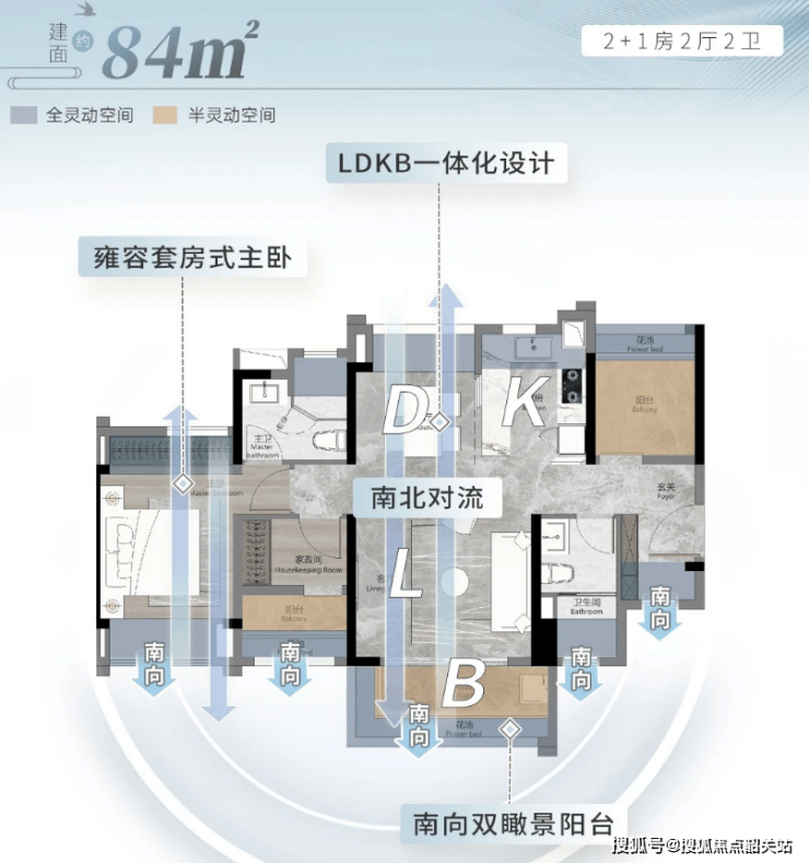 84㎡三房两厅两卫:南向双瞰景阳台,U型明厨,阔绰套房式主卧,南北对流设计,四季享新鲜氧气。