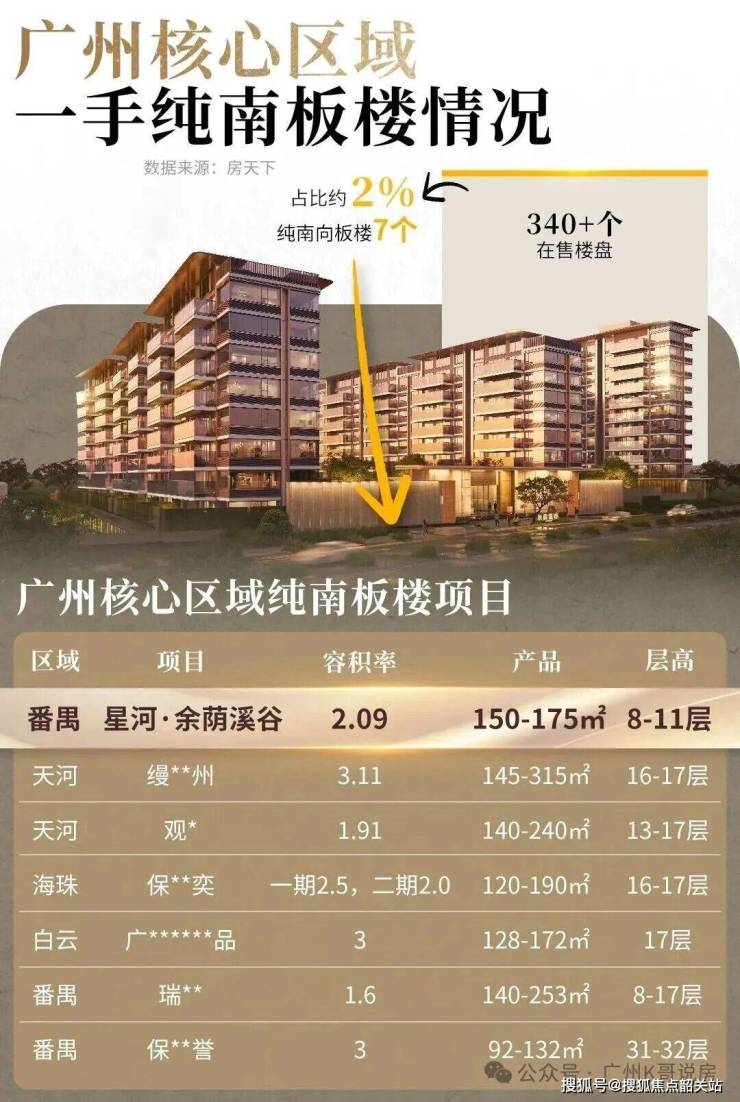 答:在广州城市核心区,土地资源日益稀缺,住宅开发普遍走向高密度、超高层的路线,动辄三四十层的超高层住宅已经成为市场常态,真正的低密住宅本就十分稀缺。过去五年,广州全市共计出让 274 宗住宅用地,其中容积率 2.0 以内的地块仅有 29 宗,占比仅约 10%,核心区的低密地块更是凤毛麟角。同时,根据不完全统计,广州核心区域在售的 340 多个楼盘中,能够做到纯南向板楼设计的不到 10 个,占比仅约 2%,而在纯南向板楼的基础上,还能做到 8-11 层低密洋房设计的,仅有星河・余荫溪谷一个项目。我们以 2.09 的超低容积率,打造全盘仅 156 户的纯粹洋房社区,这样的低密纯粹属性,在广州核心区的新房市场中,拥有无可比拟的稀缺性,是真正可遇不可求的人居藏品。