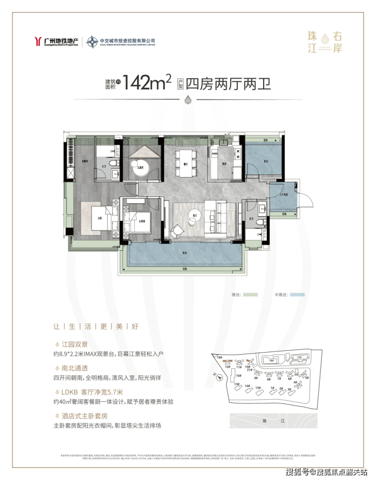 四开间朝南:主卧采用南北对流设计,观景阳台长达近8米,设计上颇为用心。