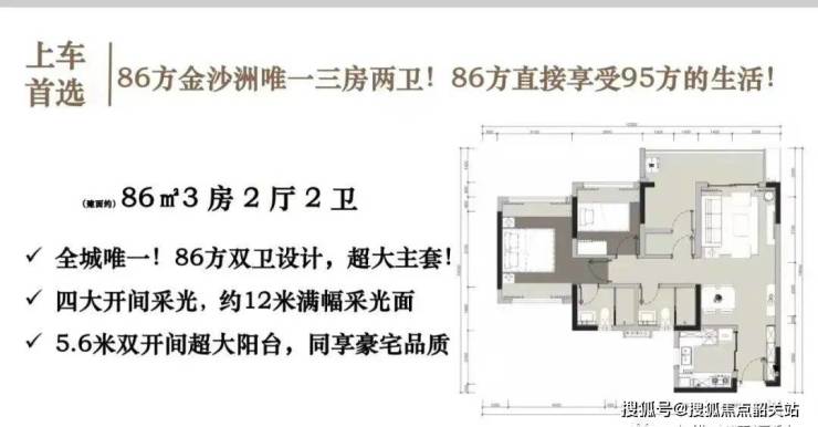 86平三房两厅两卫:竖厅设计,约5.6米大阳台,主卧套房设计带双飘窗。