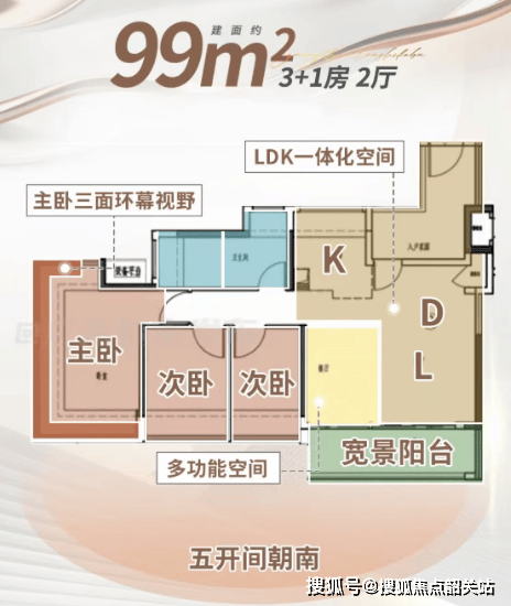 99㎡四房两卫:IMAX宽景阳台,主卧三面环幕视野设计,客厅可改造成超聚厅。