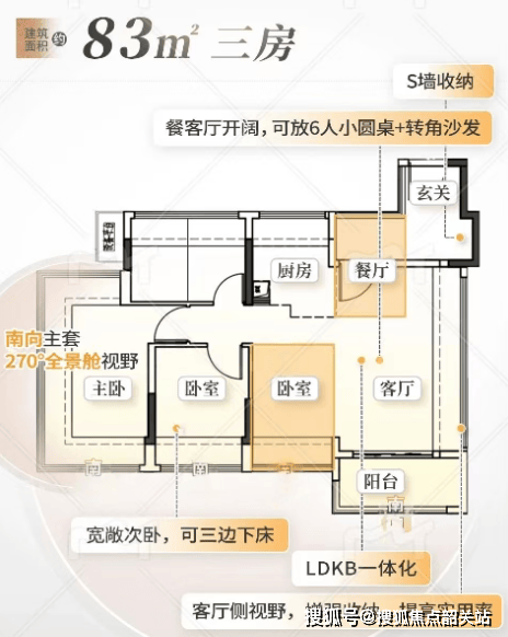 83㎡三房两卫:单边位设计,套内空间更宽敞,次卧尺度更高。