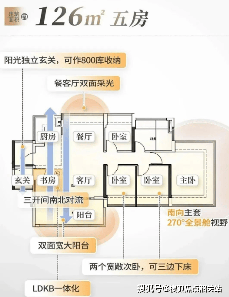 126㎡五房两卫:5.5开间朝南,南北对流,双面宽大阳台,舒适度和功能性兼备。