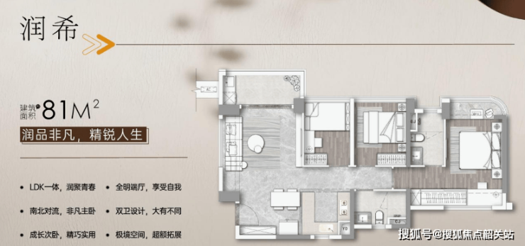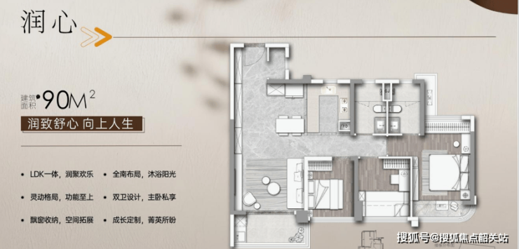 天河润府在户型设计上采用了抬高设计和创新蝶式楼型,整体建筑风格现代简洁、端庄典雅。所有户型实用率超100%,得房率高,采光良好。例如,81平方米户型三面采光,90平方米户型四开间朝南,保证了充足的阳光和通风。此外,二期推出了全新润心底盘2.0,通过智能化串联全屋,打造健康光和会呼吸的家,提升了空间颜值和居住体验。